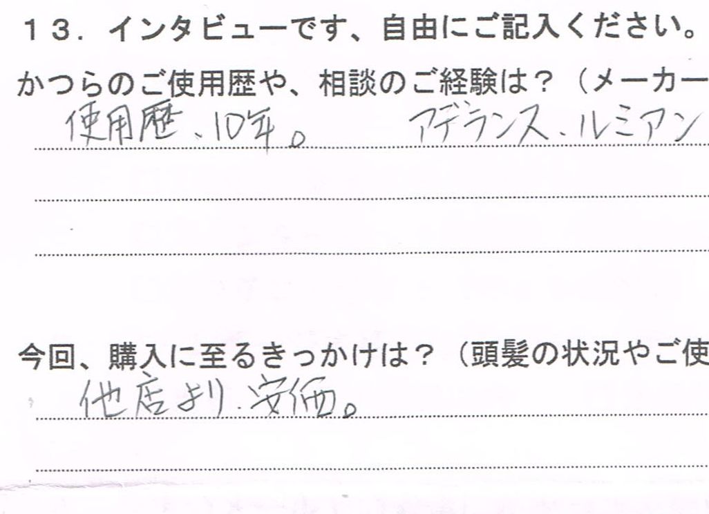 かつらはAN社で15年ほどになります。 今のが痛んできたので次のものを探していました。 東京から熱海に住居を移した事もあり、また、歳からして価格の安いのは魅力 […]