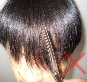(我々プロは根元や中間ぐらいからはさみを入れますが、慣れていない方は毛先だけの方が無難です。)