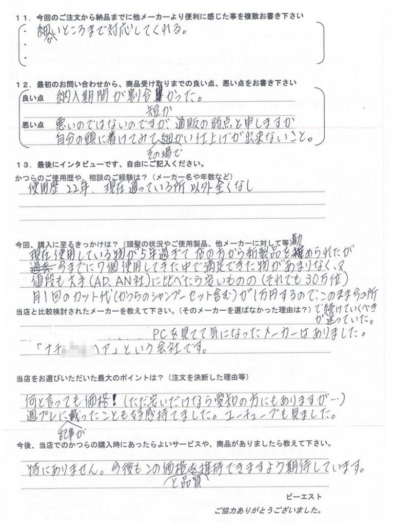 この方の場合はズバリ「かつらのカットが雑!」という事が分かりましたので、当店の技術で十分対応可能と判断しました。それにしてもかつらメーカーに通われていて、製品の品質やカットなどの技術に不満な方は多くいらっしゃいます。