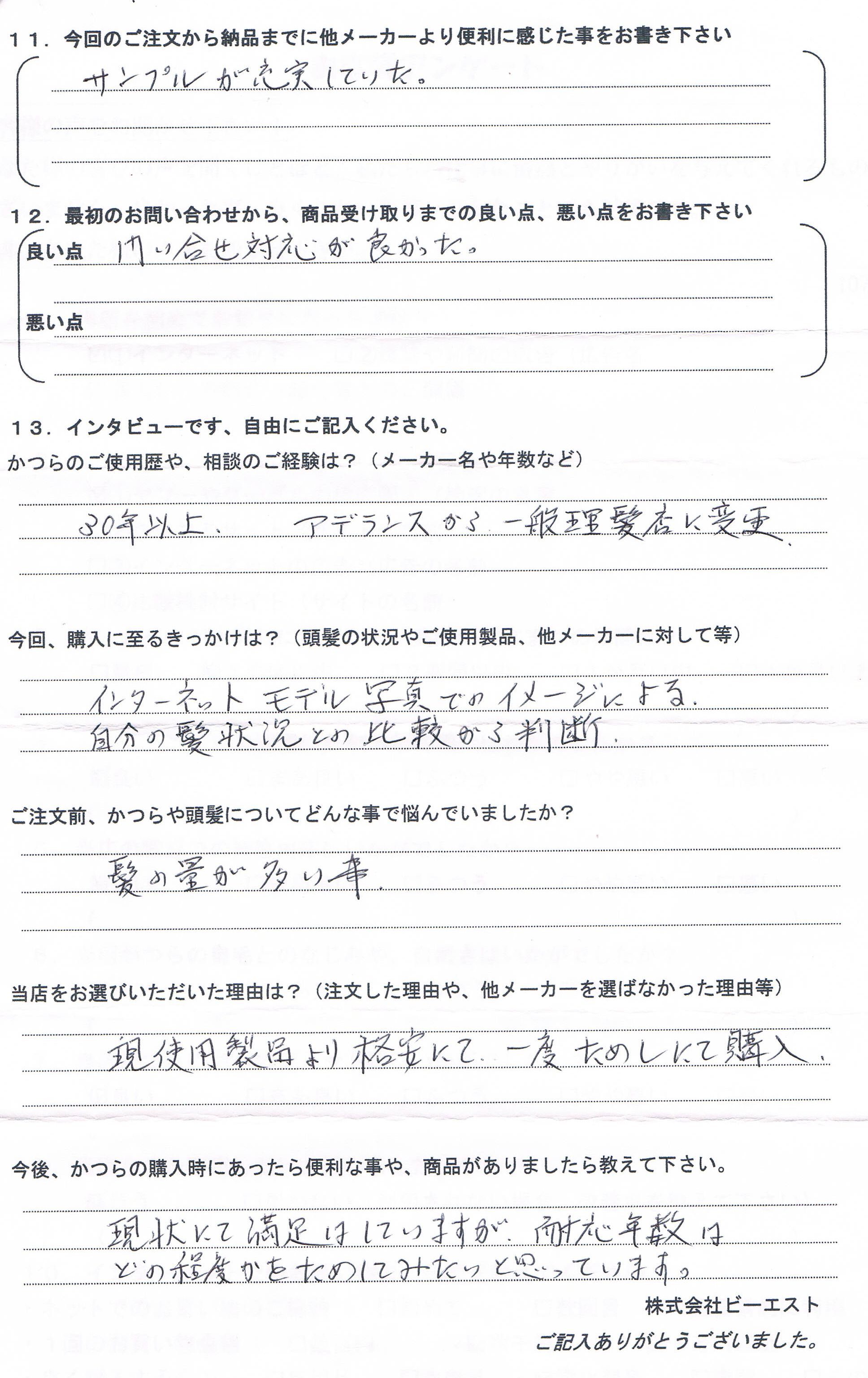 見本かつらお試しの後に電話でのヒアリングもありまして、迷う事もありませんでした。