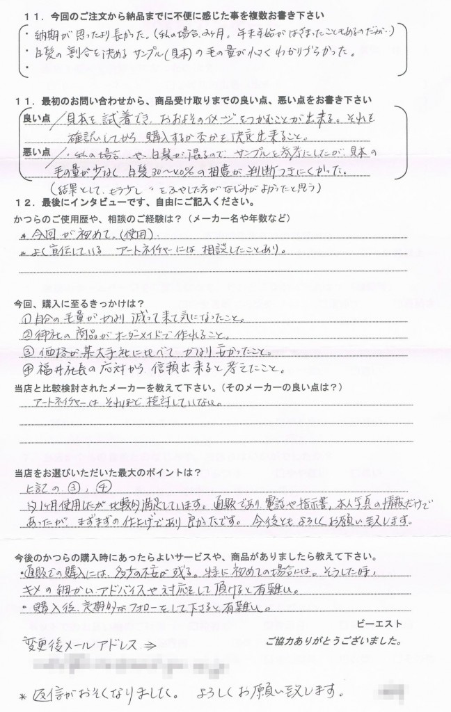 こちらでは、オーダーメイドのかつらを安く購入できる事が気に言って注文しました。