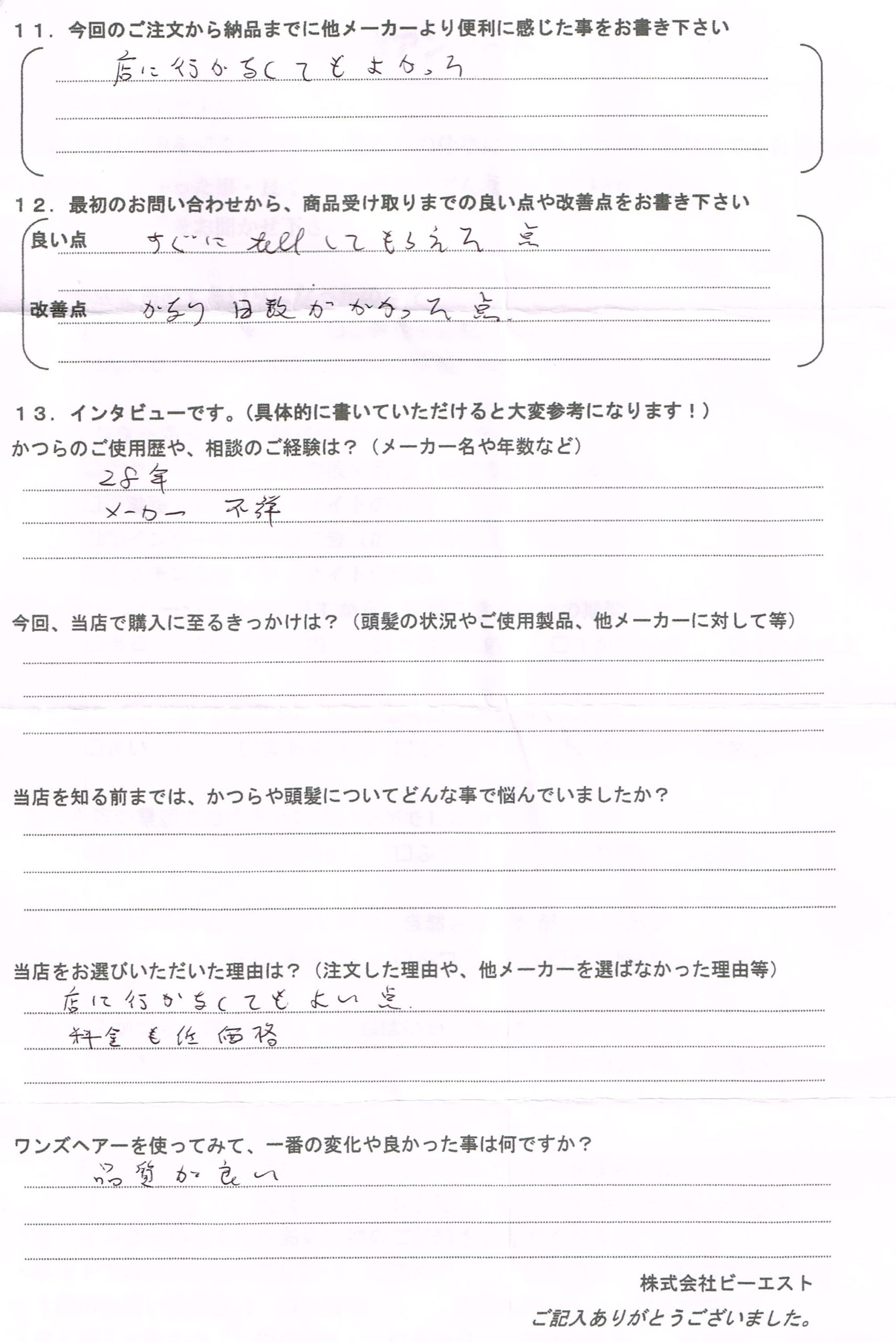 こちらのような通信販売でオーダーかつらは初めてでしたので、ちょっと不安は有りましたが、ネットで注文後すぐに電話してもらえたので安心できましたね。