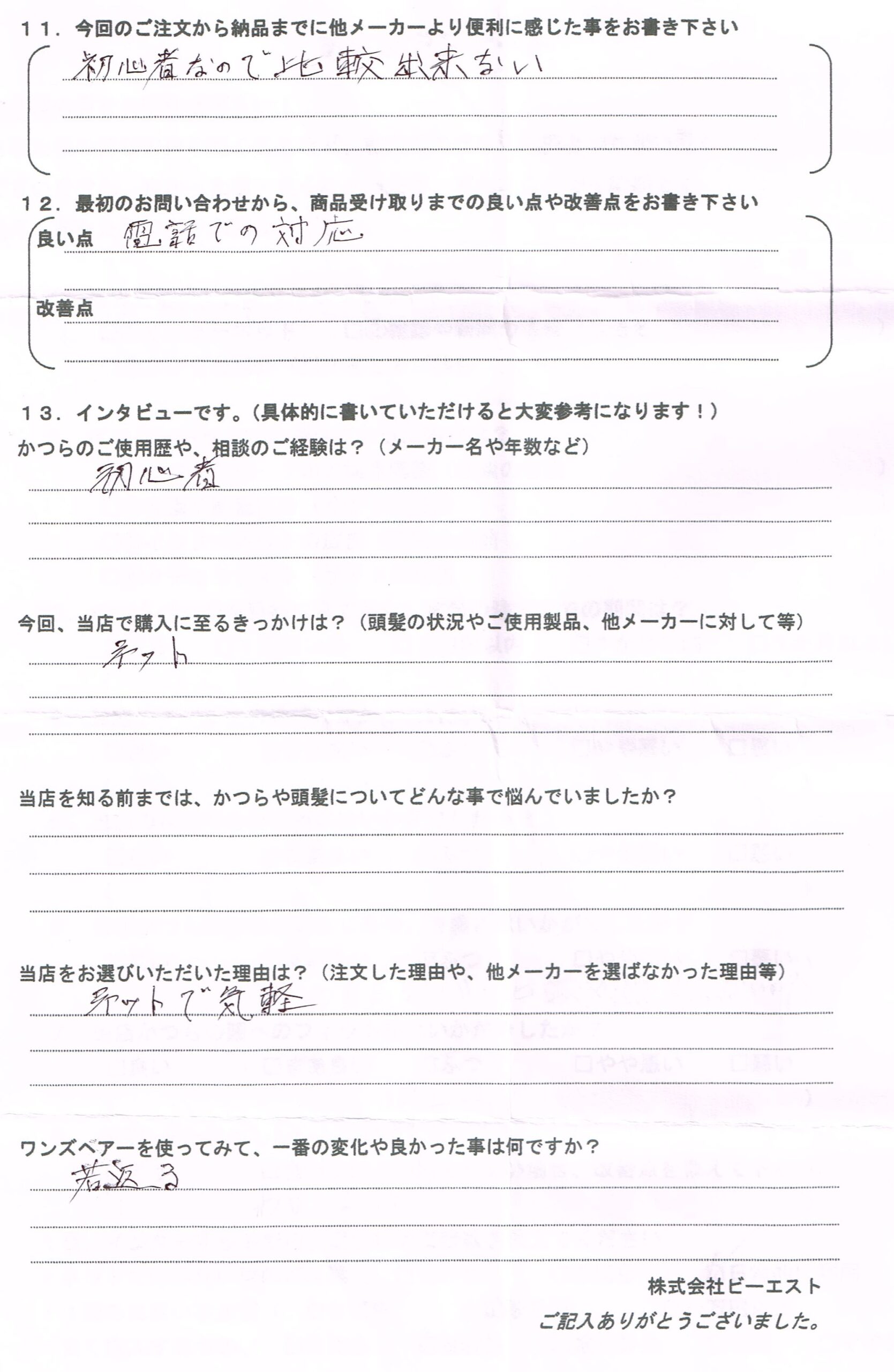 今回、見本のかつらでお試しできたので、家族や知人の好反応も見れて進める事ができました。