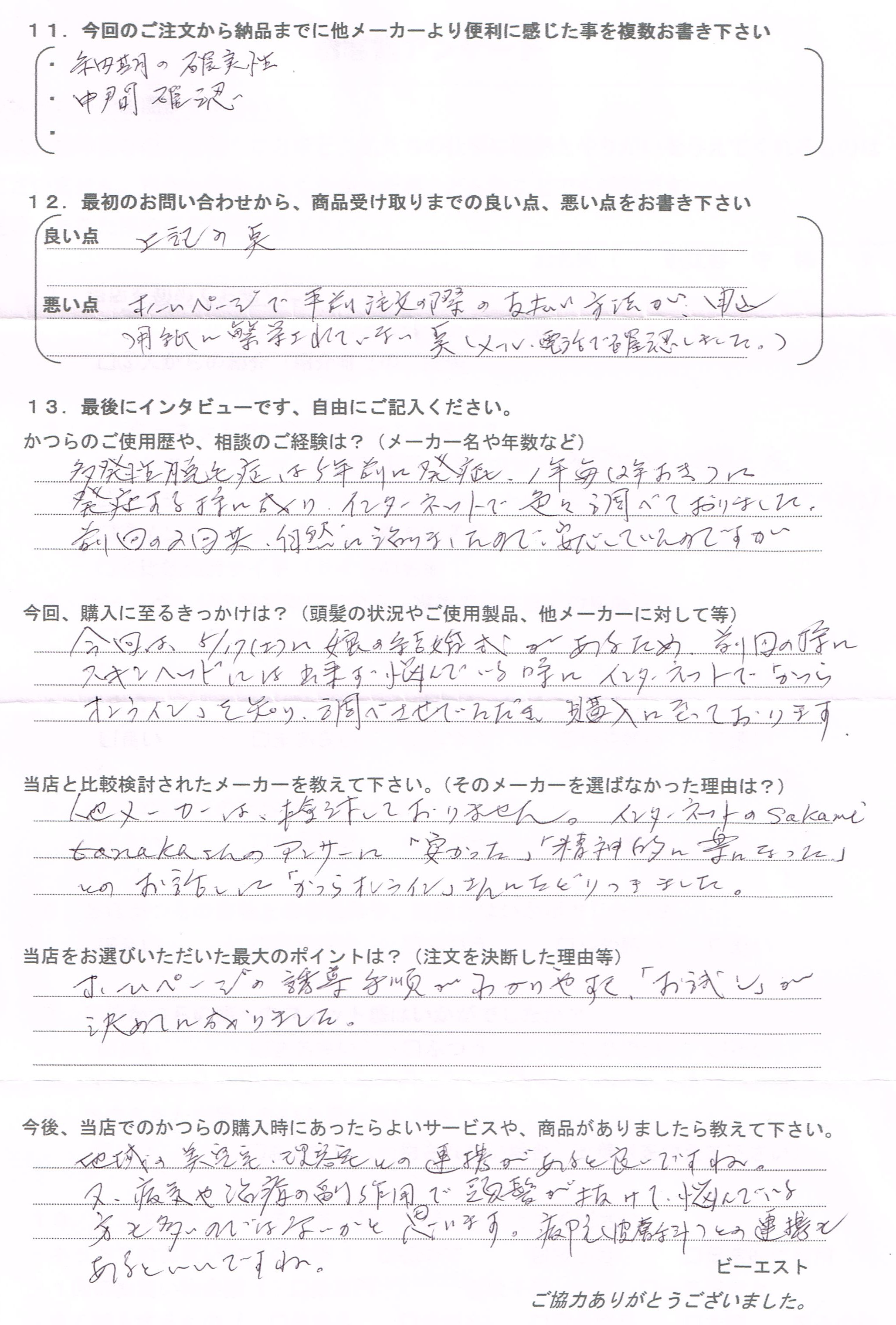 今回は、娘の結婚式がある為、前回のようにスキンヘッドには出来ず悩んでいる時に、インターネットで「かつらオンライン」を知り、調べさせていただき購入に至っております。