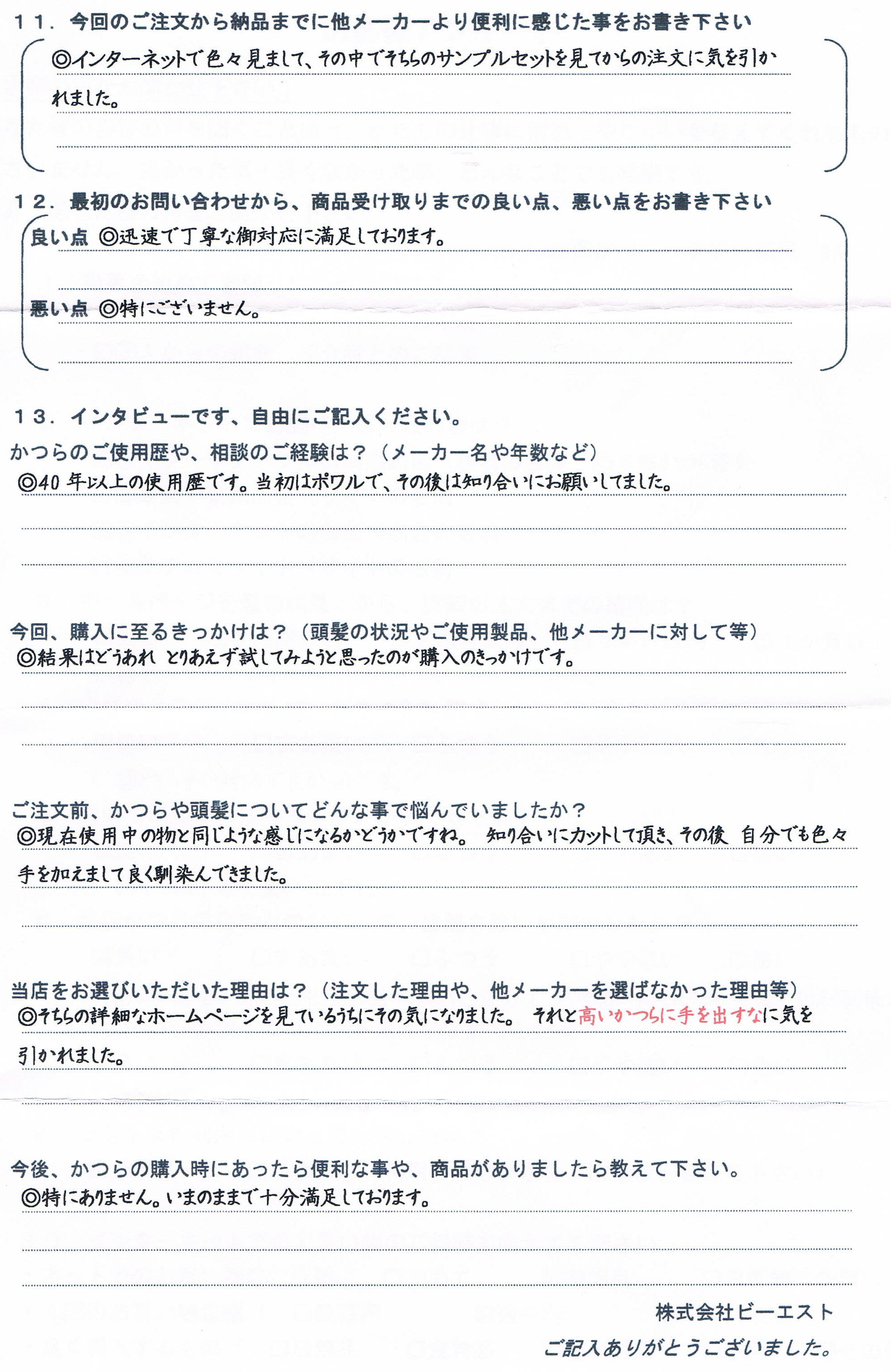知り合いが私のかつらをカットしてくれますが、その方からこちらの会社を紹介されて注文しました。