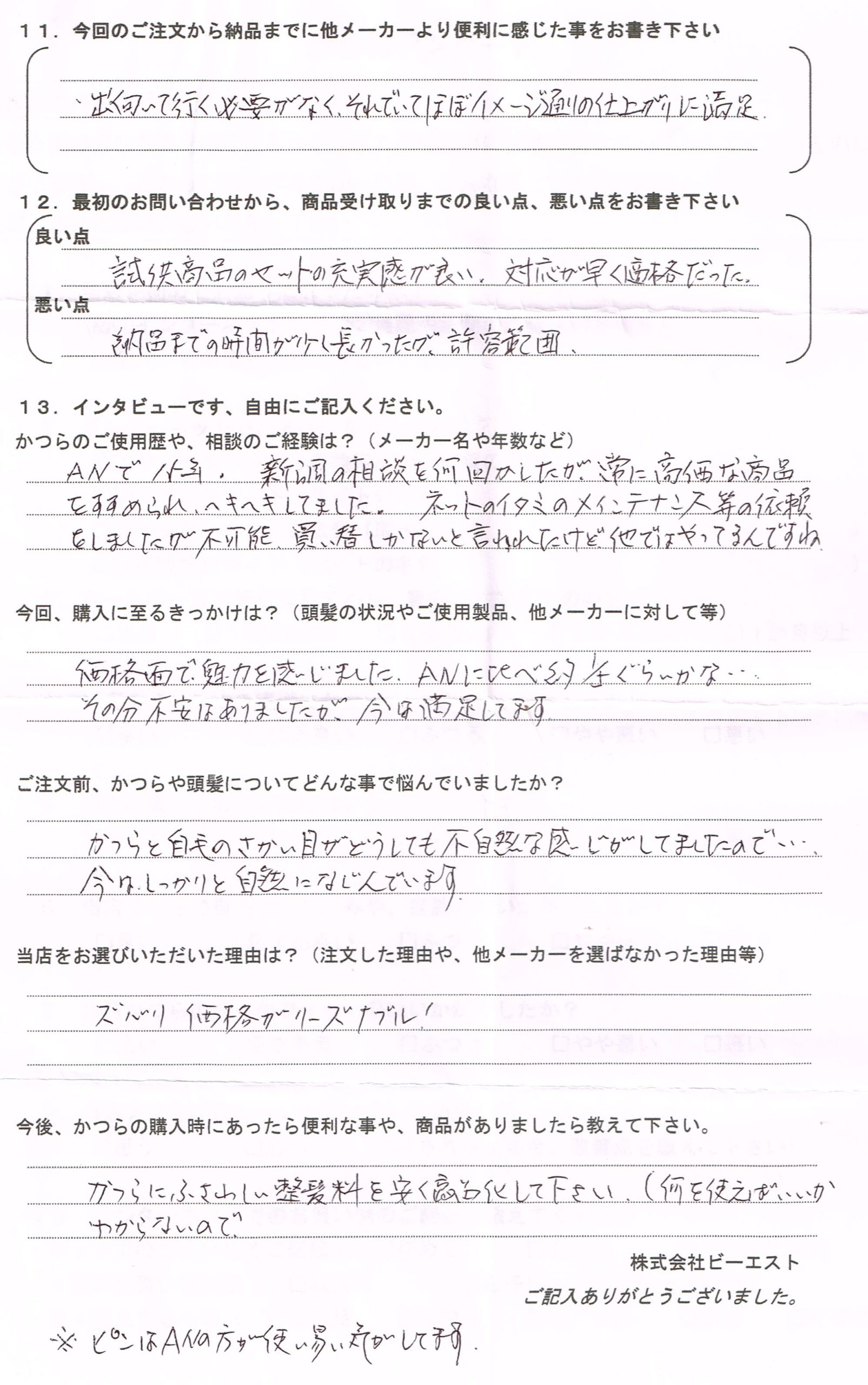 かつらの注文で、お店に出向いていく必要が無く、それでいてほぼイメージ通りの仕上がりに満足です。
