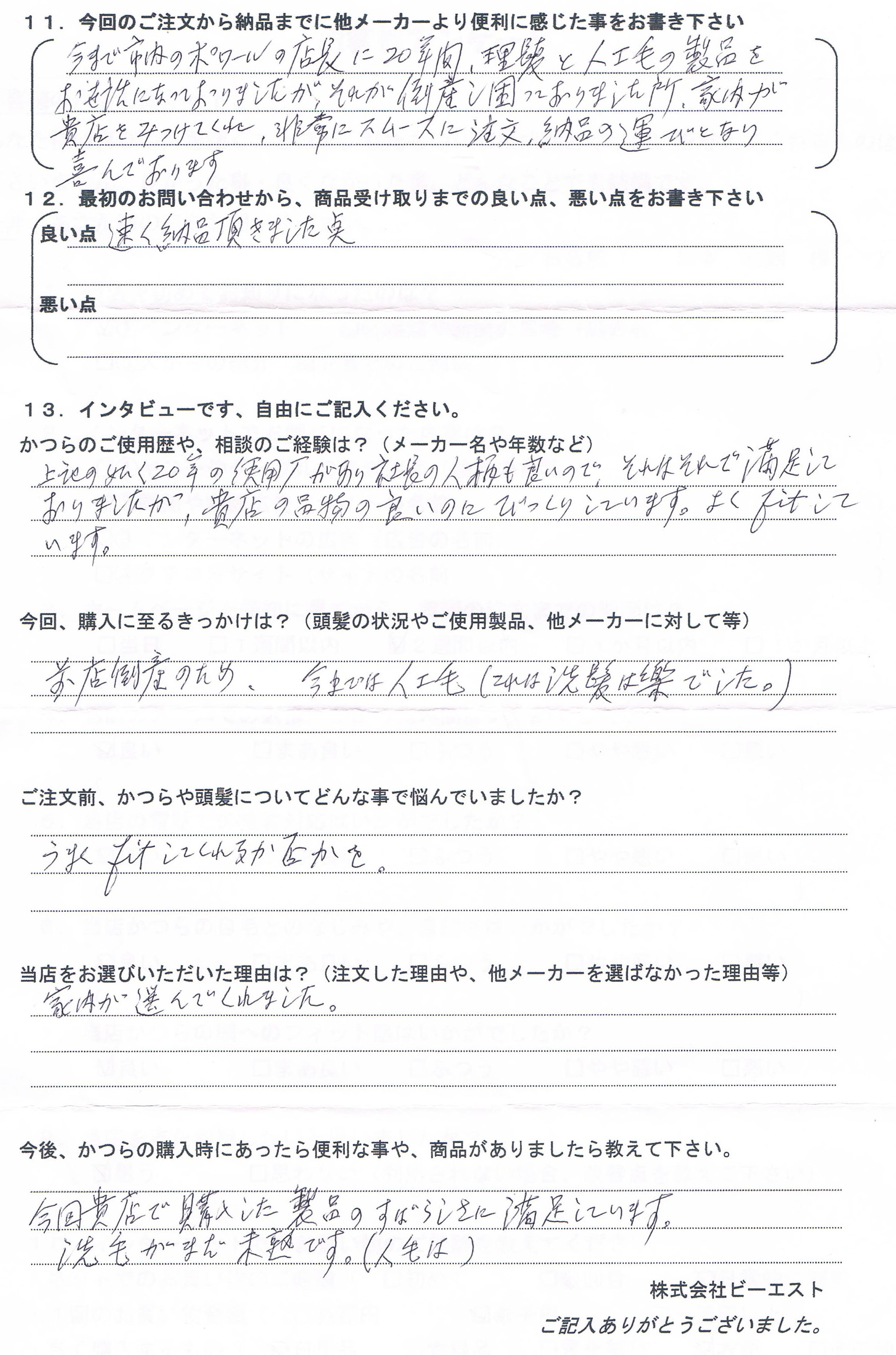 完成したかつらも早く納品頂いて、その製品のすばらしさに満足しています。