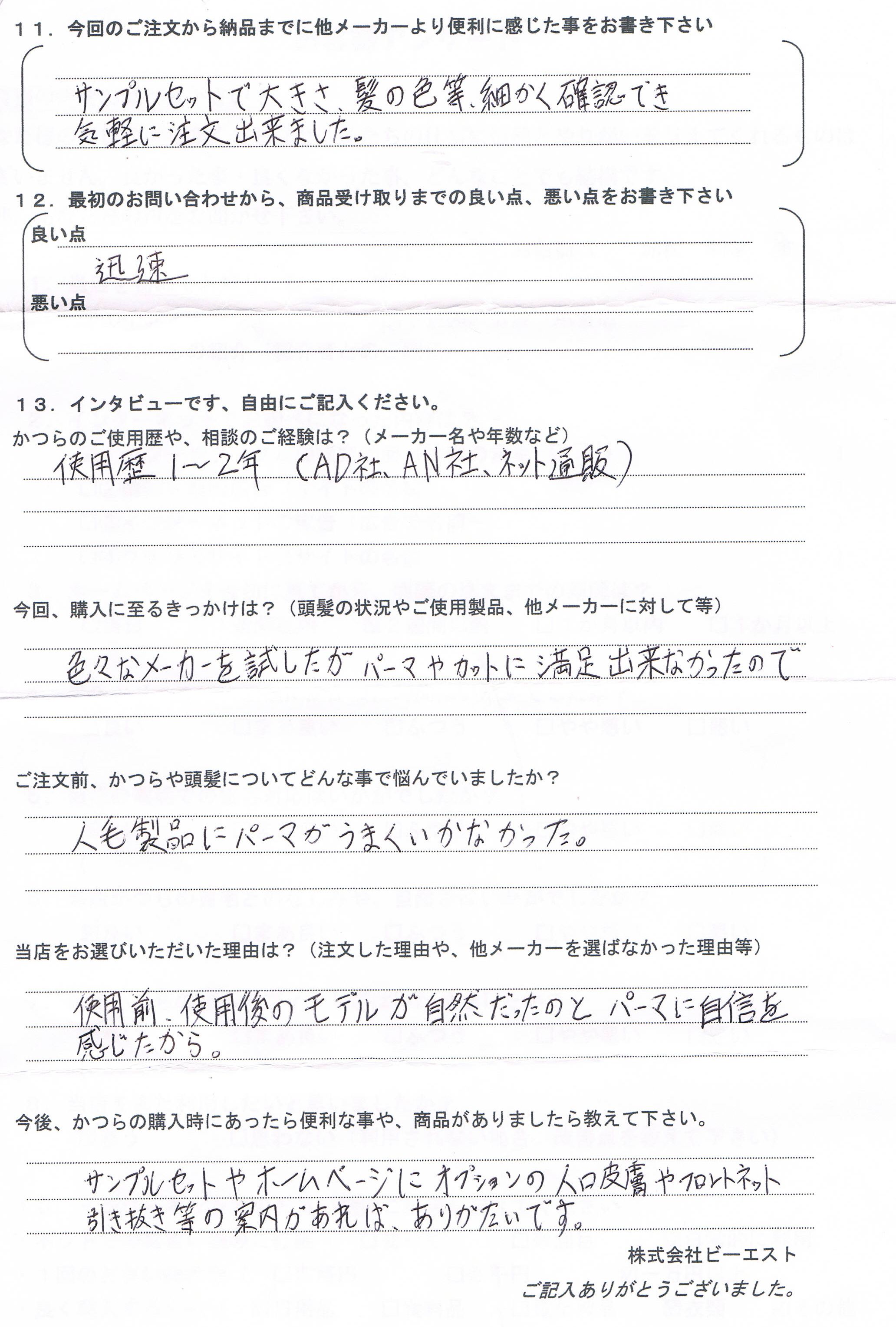 こちらの会社を選んだ理由は、かつらの使用前・使用後のモデルが自然だったのと、電話相談でのお話しでパーマに自信を感じたからです。