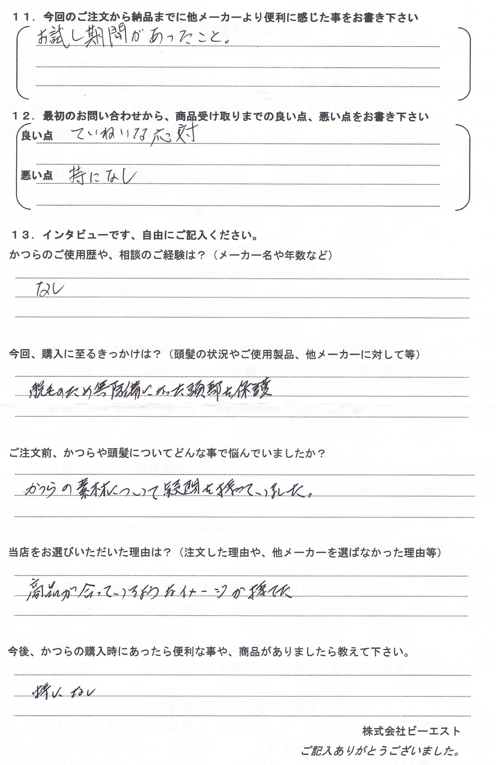 「本日カツラ受け取りました。予想どうりで気に入ったようです。ご親切な対応ありがとうございました。」