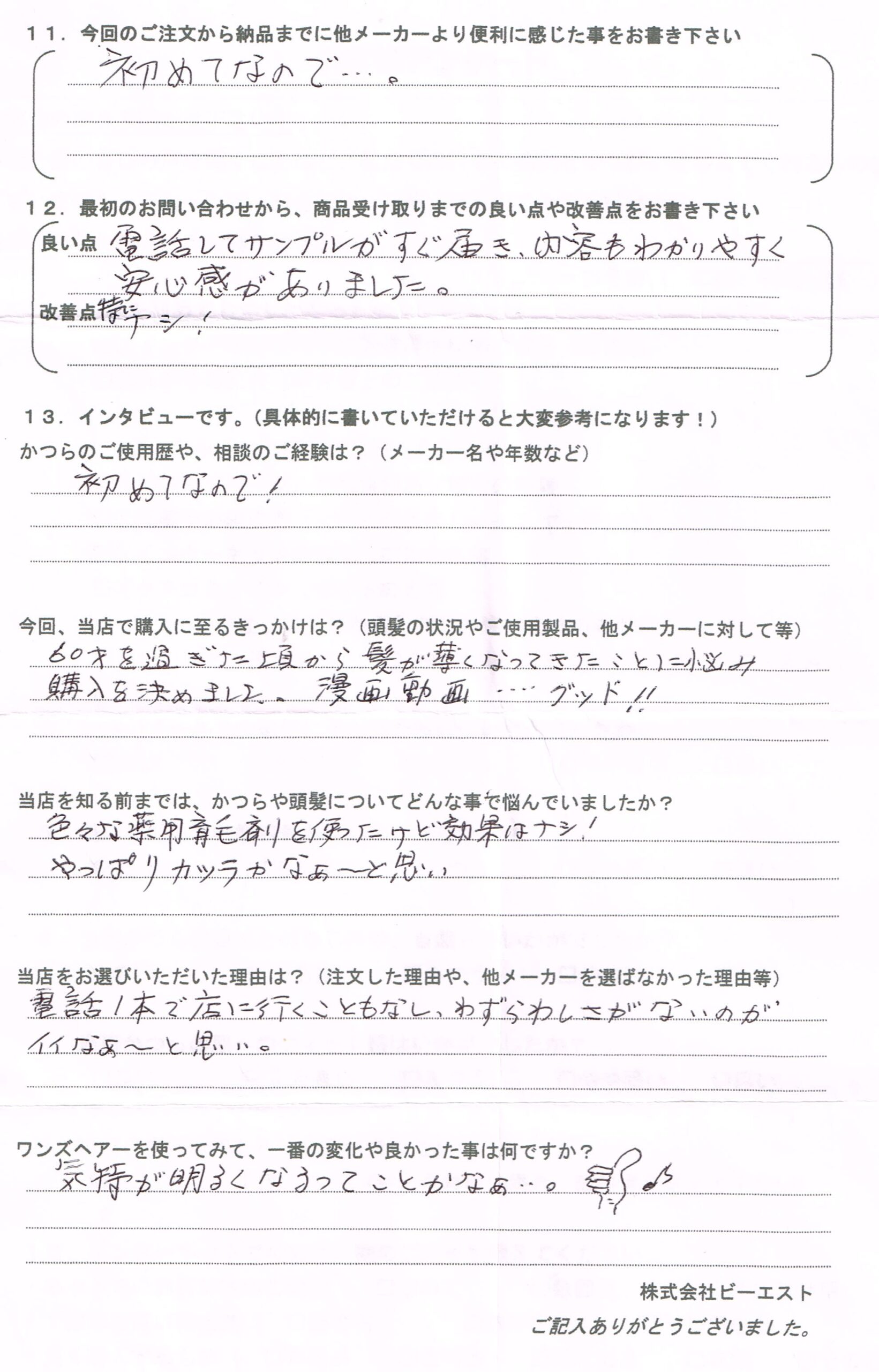 かつらオンラインは電話1本で店に行く事もなし、わずらわしさがないのがいいなぁ~と思い注文しました。