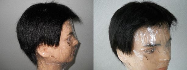 この様な場合、当店では毛量を減らすのと同時に かつらの毛の根元に特殊な薬品を使用して毛を寝かせる処置をします。