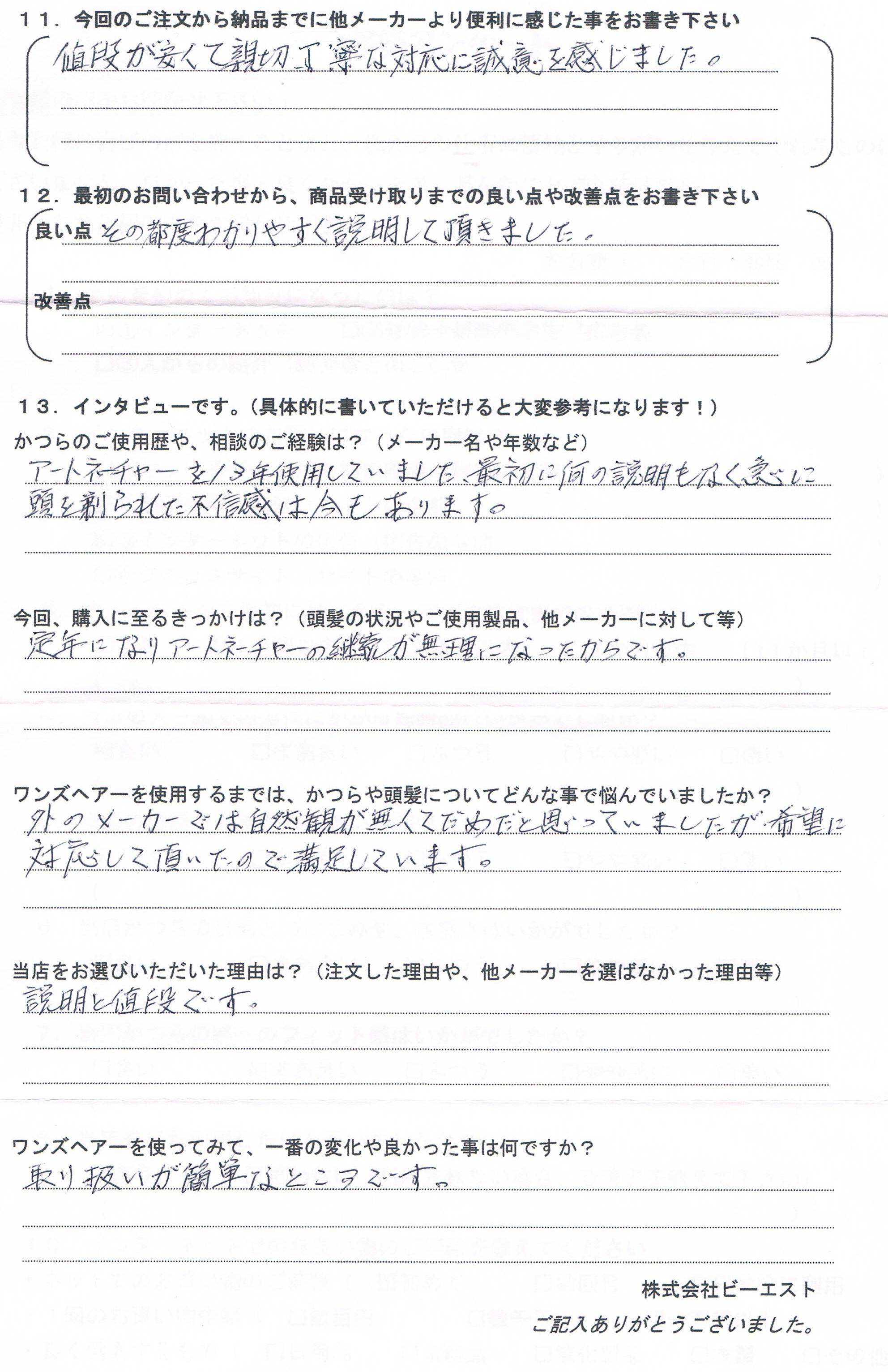 出来上がったかつらは、毛量が少し多くて白髪が少ないと感じましたが、店長さんのアドバイスもあり毛量だけを減らしてもらったところ、丁度良い感じに仕上がりました。