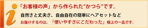 「もっと髪型をこうしたい。」 「こういったベース素材は無いか?」 「こんな色を追加して欲しい」等の、お客様のご意見をふんだんに取り入れたかつらをお届けします。