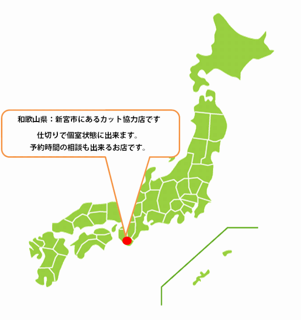 全国カット協力店【和歌山】 かつらオンラインの全国カット協力店【和歌山】 かつらオンラインでは、個室や完全予約、そして営業時間外の対応など、 お客様が人目を気にする事無く、普段のカット(散髪)に困らないよう、全国にカット協力店があります。 かつらに合わせて、自毛を最適な長さと量にカットしてくれます。 選りすぐりの理美容室があなたをお待ちしております。 ご紹介致しますので、ご利用の際はお声をお掛け下さい。 また、お住まいの近くに協力店の無い場合は、お探し出来ることもあります。 併せて、お気軽にご相談下さい。 ≫TOP ページへ