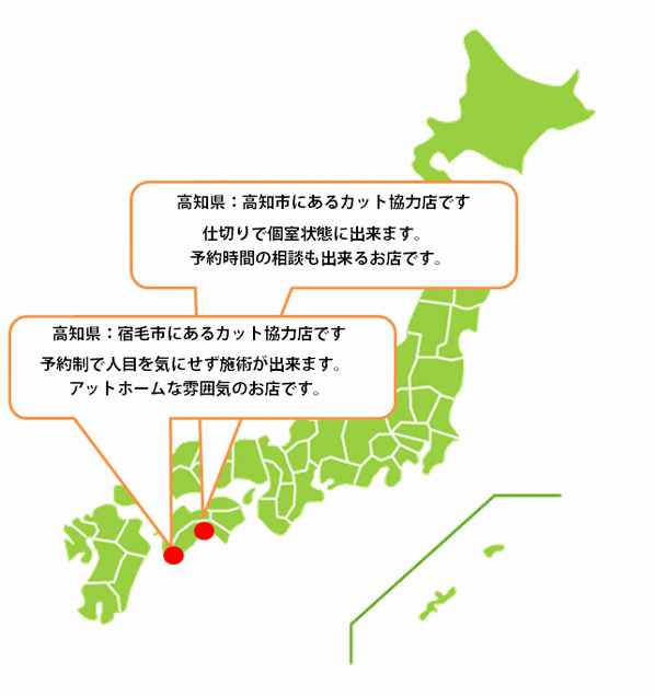 全国カット協力店【高知】 かつらオンラインの全国カット協力店【高知】 かつらオンラインでは、個室や完全予約、そして営業時間外の対応など、 お客様が人目を気にする事無く、普段のカット(散髪)に困らないよう、全国にカット協力店があります。 かつらに合わせて、自毛を最適な長さと量にカットしてくれます。 選りすぐりの理美容室があなたをお待ちしております。 ご紹介致しますので、ご利用の際はお声をお掛け下さい。 また、お住まいの近くに協力店の無い場合は、お探し出来ることもあります。 併せて、お気軽にご相談下さい。 ≫TOP ページへ