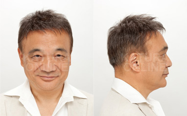 男性かつらの使用前、使用後の画像紹介です。 薄毛の範囲が広くて自毛も少ないので、かつらの毛量も少なめに仕上げています。
